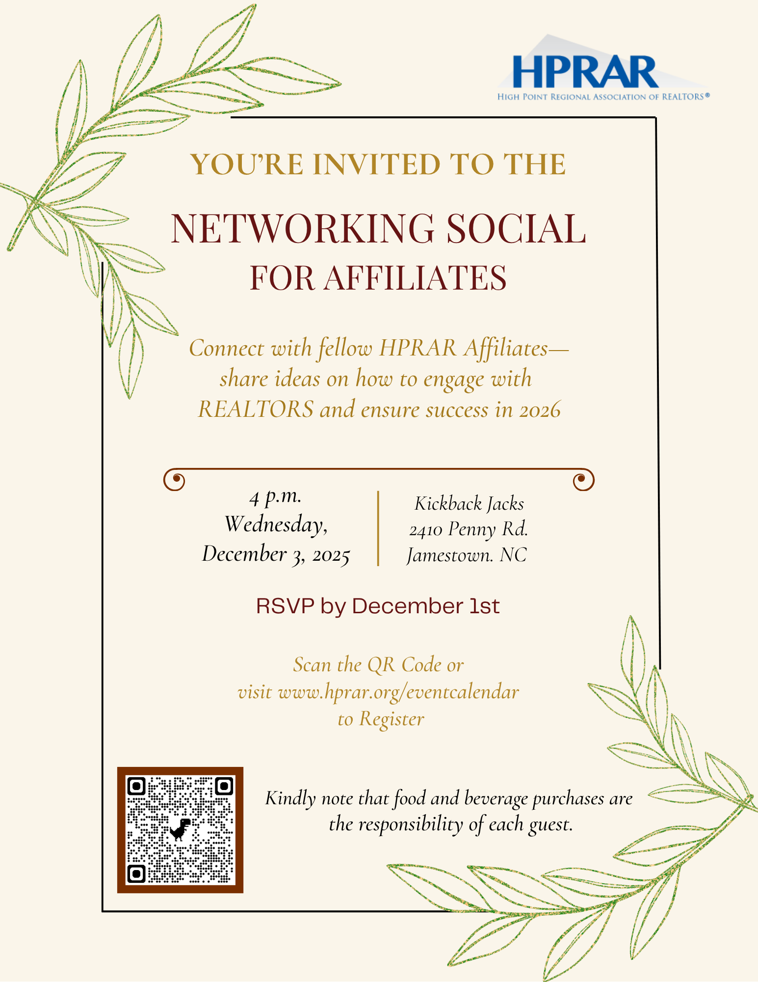 Join your fellow Affiliates for a networking Social. This is your chance to leverage your HPRAR Membership, celebrate your year and set your goals. Come to Kickback Jack's and enjoy! Take this opportunity to network with other people in your field, compare marketing strategies and discuss what you would like to see happen in your business for the coming year with HPRAR.
