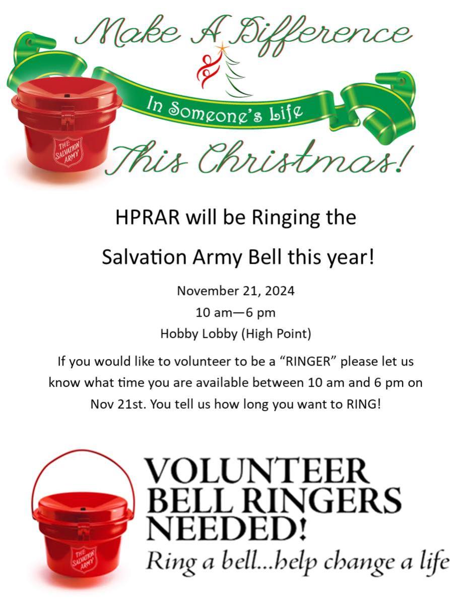 HPRAR members will be in front of the Hobby Lobby in High Point on November 21st from 10 am - 6 pm. Please register to volunteer to ring the bell - all shifts available!
